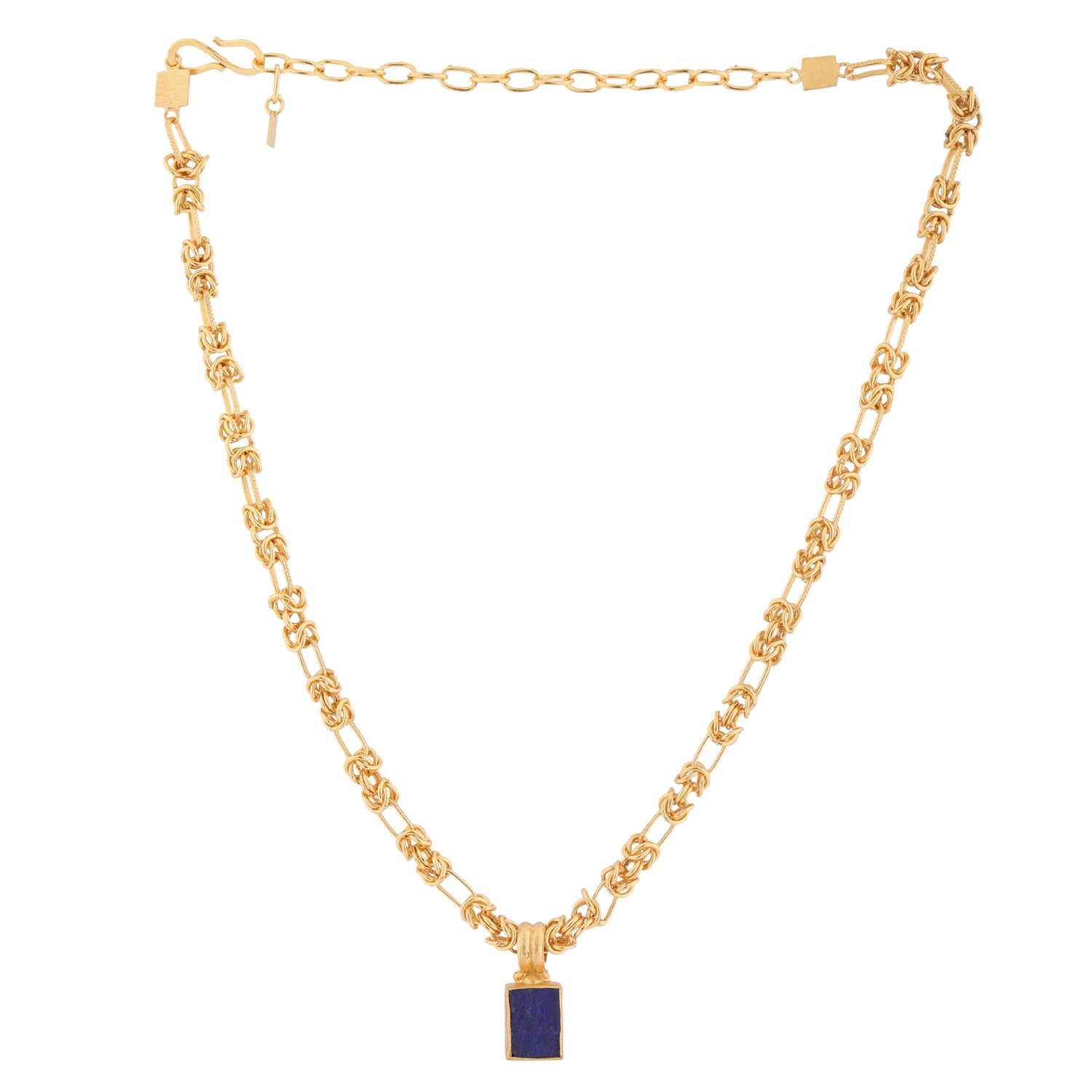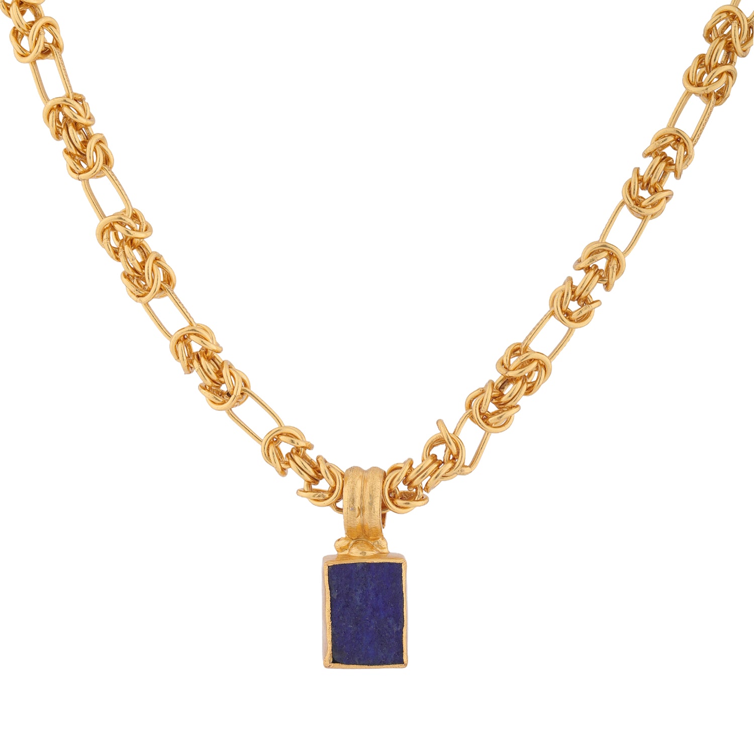 Desde tiempos inmemorables, las cadenas han simbolizado unión y permanencia. El collar AMULET retoma esa herencia con una laboriosa cadena artesanal, de la que pende un pequeño Lapislázuli como pequeño amuleto, reflejando la belleza de lo ancestral y lo auténtico.