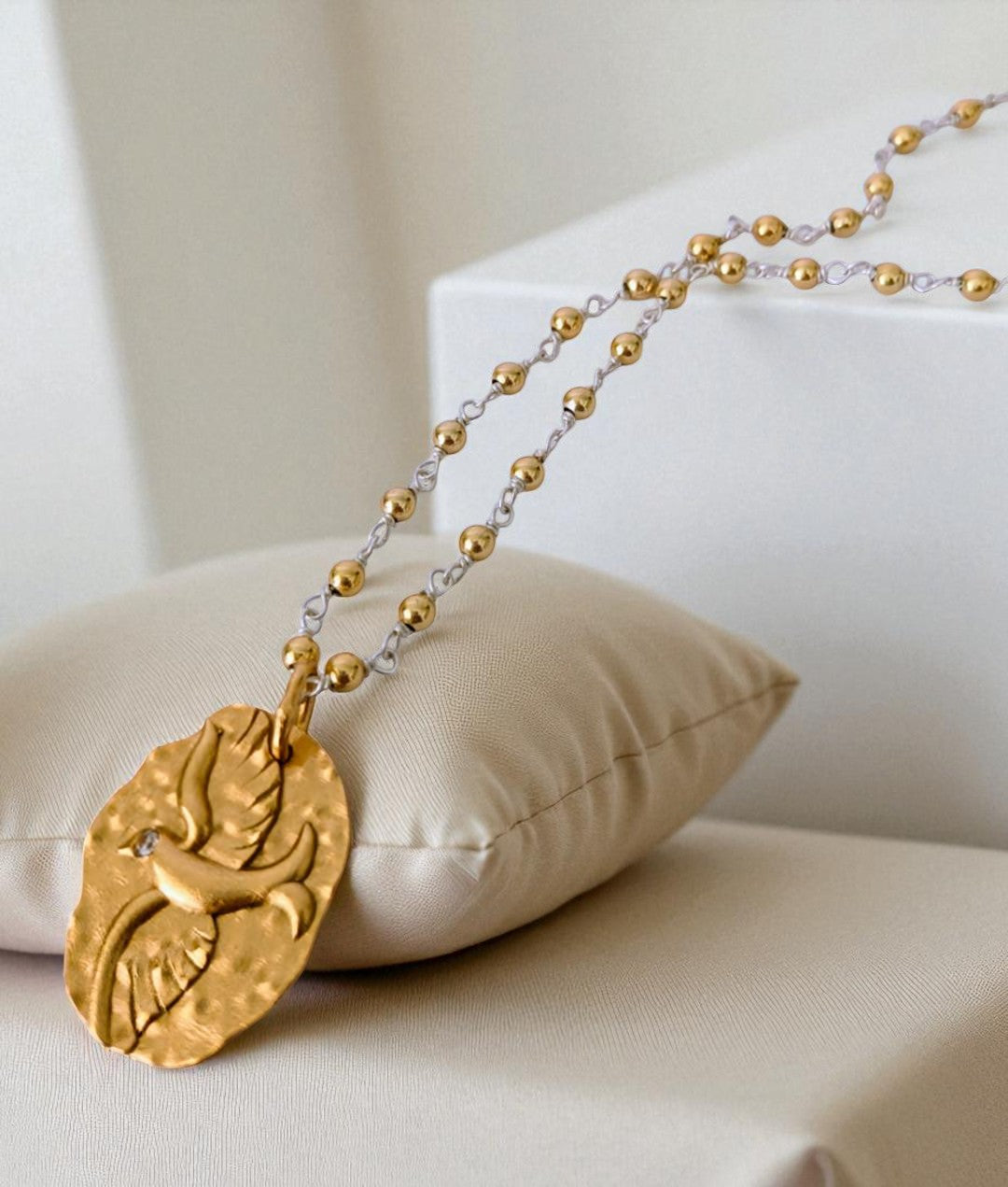 El collar HOPE eleva la imagen de una paloma en vuelo, delicada y poderosa a la vez. Representa paz, vida nueva y libertad, suspendida de una cadena bicolor que une plata y oro en armonía, revelando una joya que inspira y transforma.