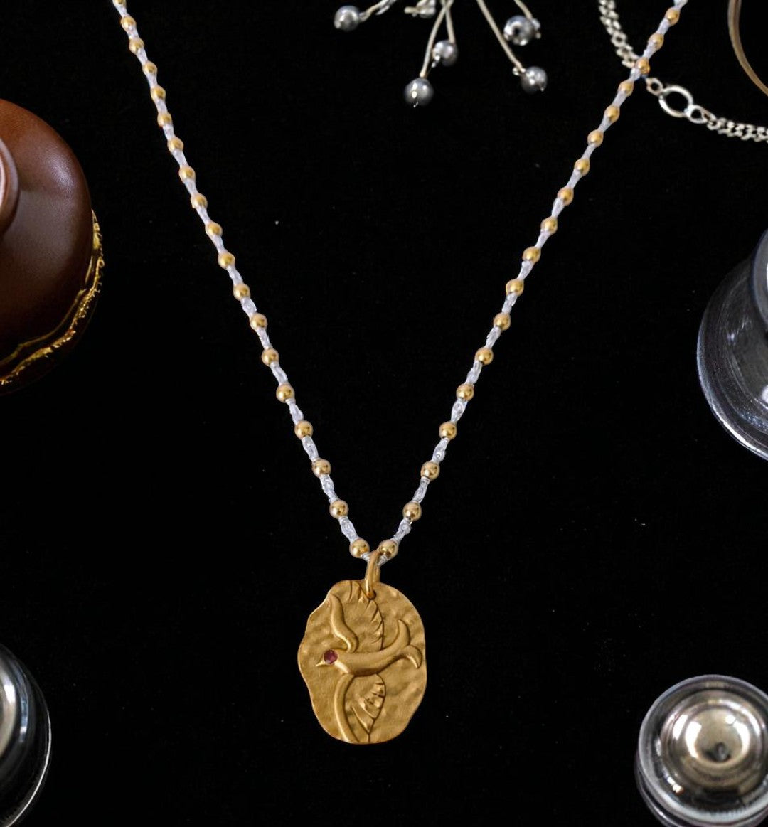 El collar HOPE eleva la imagen de una paloma en vuelo, delicada y poderosa a la vez. Representa paz, vida nueva y libertad, suspendida de una cadena bicolor que une plata y oro en armonía, revelando una joya que inspira y transforma.
