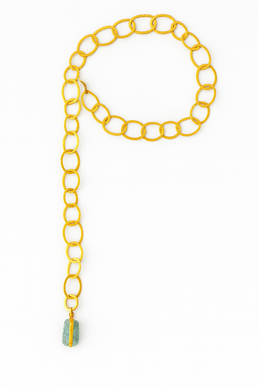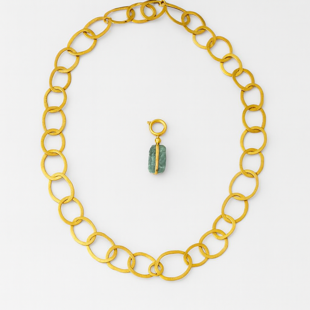 Un diseño que no sigue reglas. Este collar artesanal está formado por arandelas irregulares hechas a mano, creando un ritmo orgánico y elegante en cada curva. En el centro, una aguamarina bruta cuelga con toda su fuerza: cruda, vibrante, única.