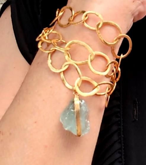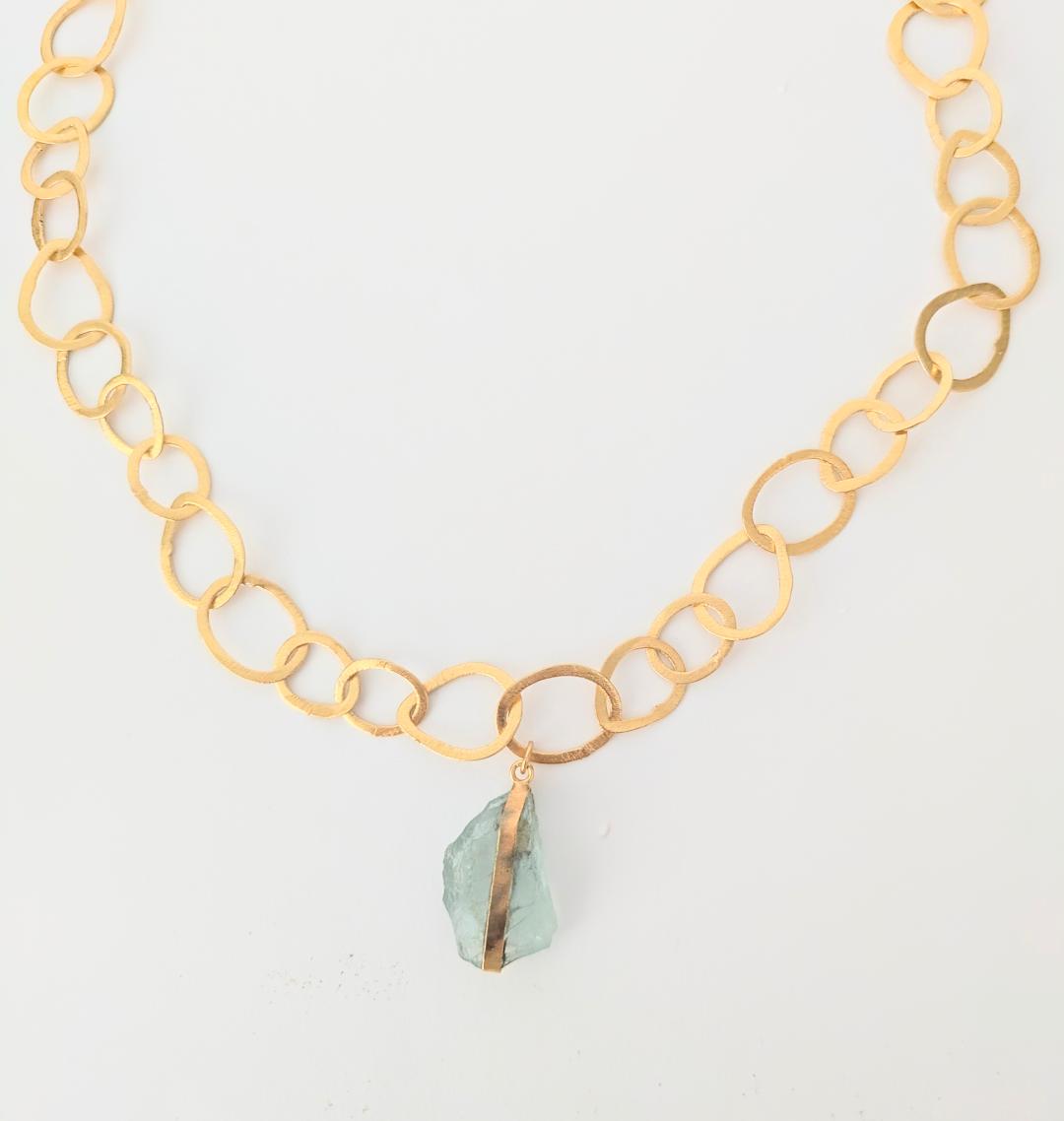 Collar artesanal de diseño único, compuesto por arandelas irregulares hechas a mano, que aportan un encanto orgánico y auténtico. Como pieza central, una impresionante Aguamarina bruta cuelga con su belleza natural y energía vibrante. Versátil y elegante, este collar puede llevarse de cinco maneras diferentes, adaptándose a cualquier estilo y ocasión. Una joya llamativa que combina sofisticación y originalidad en cada detalle.