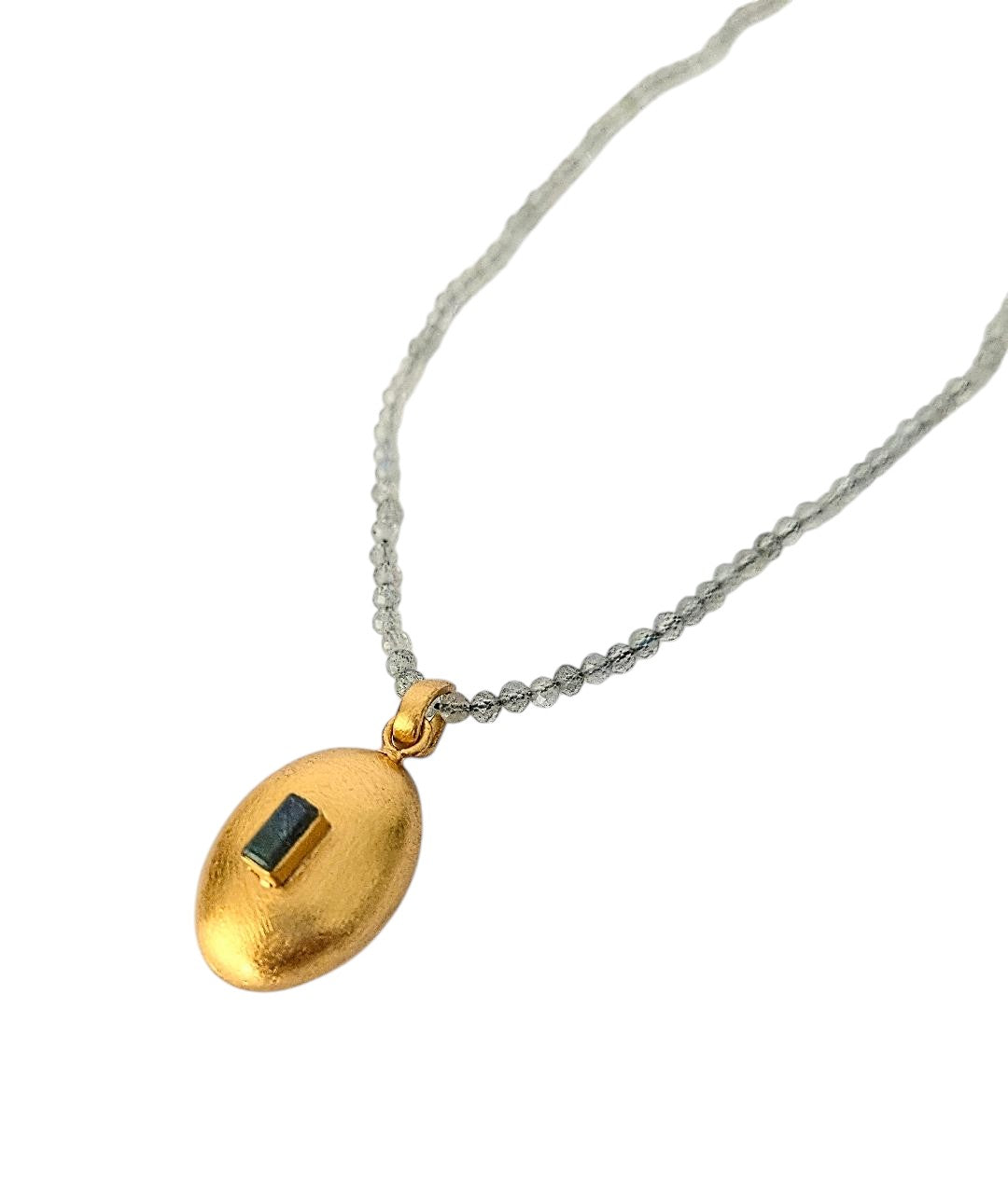 Un diseño que parece rescatado de un relicario medieval, reinterpretado con una mirada contemporánea. Este collar combina una delicada cadena de labradoritas facetados —profundos, intensos, vibrantes— con un colgante dorado de líneas suaves, casi votivas. En el centro, una piedra labradorita rectangular engastada que atrapa la luz y la mirada. Una joya que habla de historia, elegancia y fuerza.