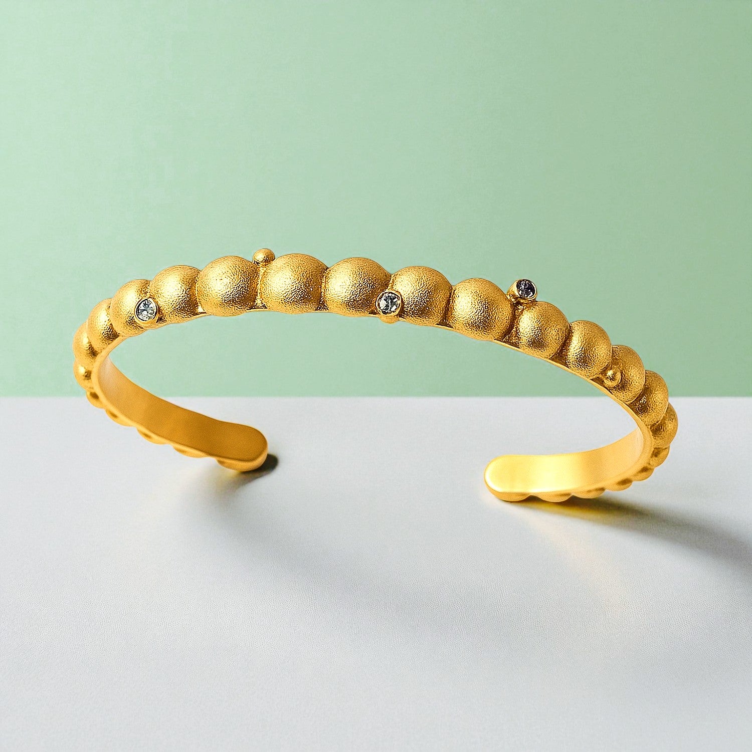 Una pieza escultural que celebra el volumen y la textura. La pulsera Gaia está compuesta por esferas doradas con un acabado mate suave al tacto, salpicadas con pequeños cristales que capturan la luz con cada movimiento. Abierta y ajustable, envuelve la muñeca con una elegancia sólida y moderna.