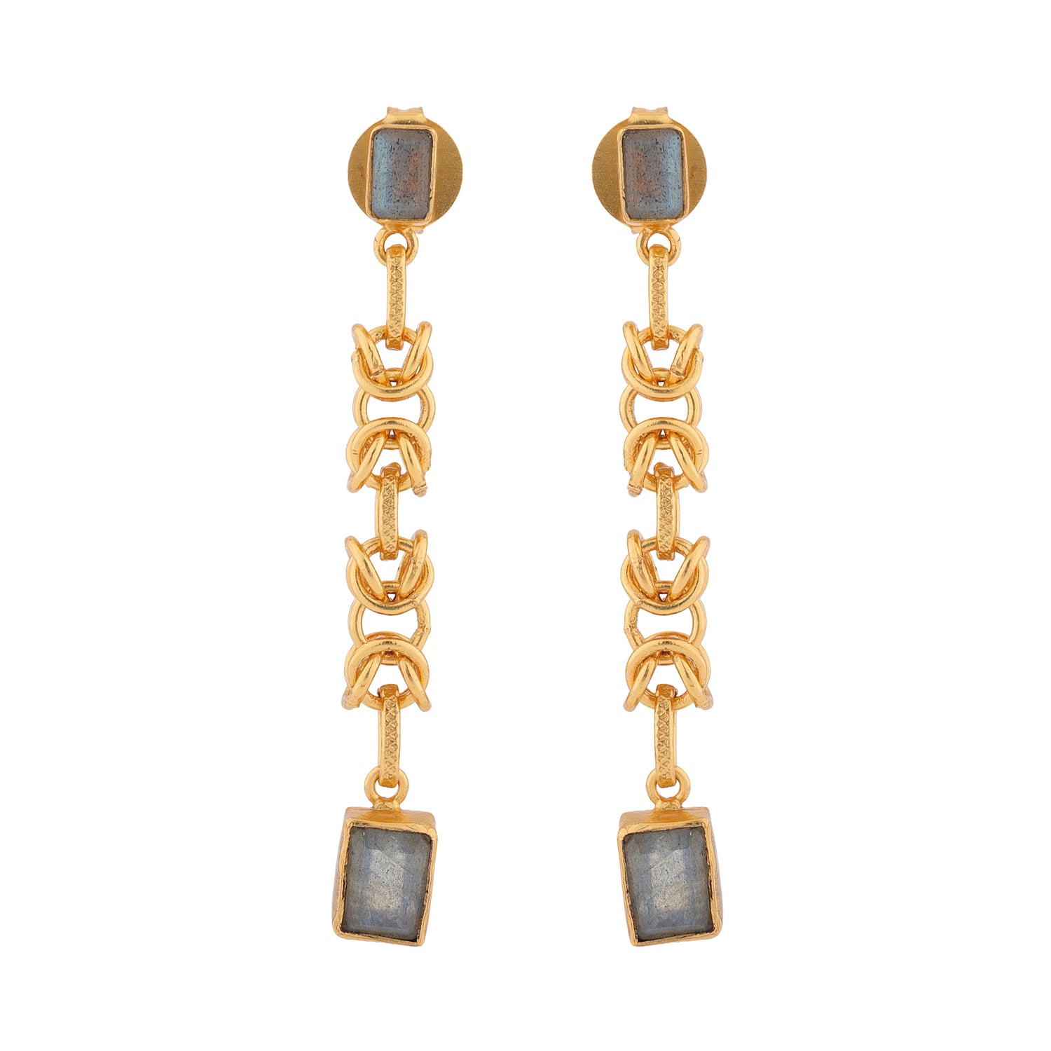 Dos piedras de Labradorita, ligadas por una cadena hecha a mano de intrincado diseño, dan vida a unos pendientes que se balancean con gracia como fragmentos de cielo tornasolado